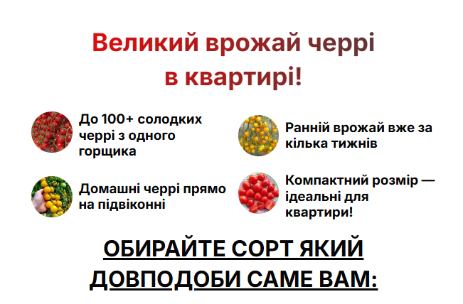 Адаптація до будь-яких умов Наші сорти виведені спеціально для компактного вирощування. Вони стійкі до типових хвороб томатів, не бояться перепадів температур і стабільно плодоносять навіть у горщиках на балконі.